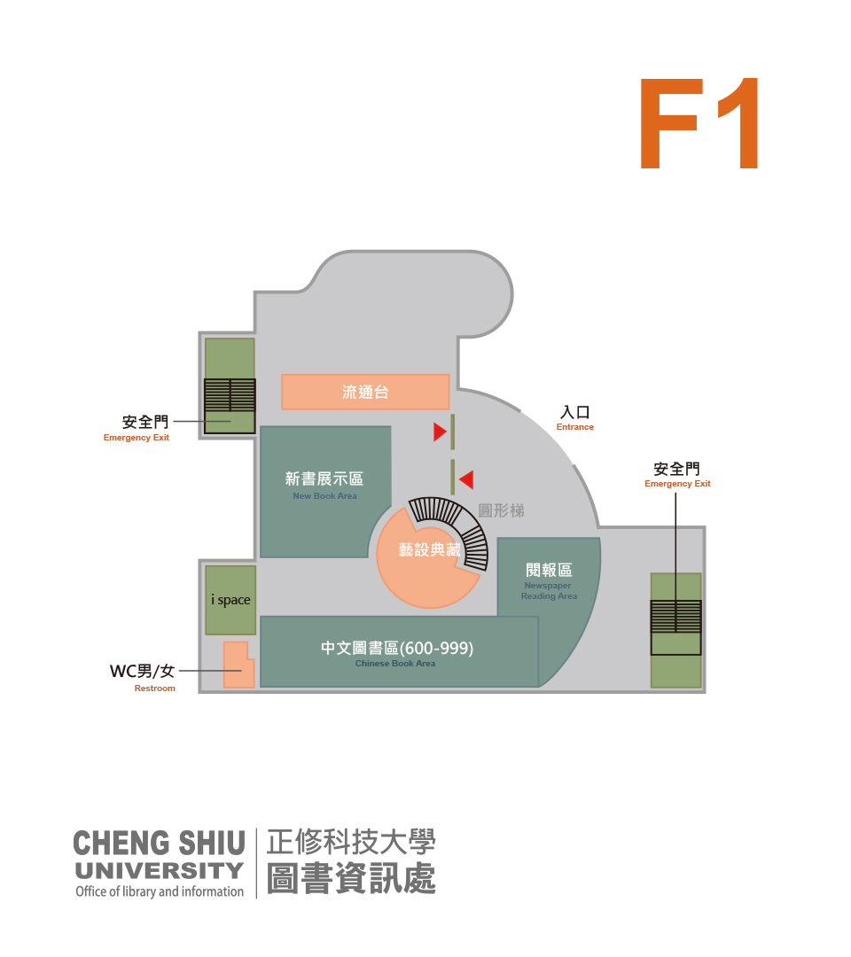 辦公室、入口大廳區、流通服務台、資料檢索區、中文圖書區、新書展示區、閱報區、藝設典藏、i Space