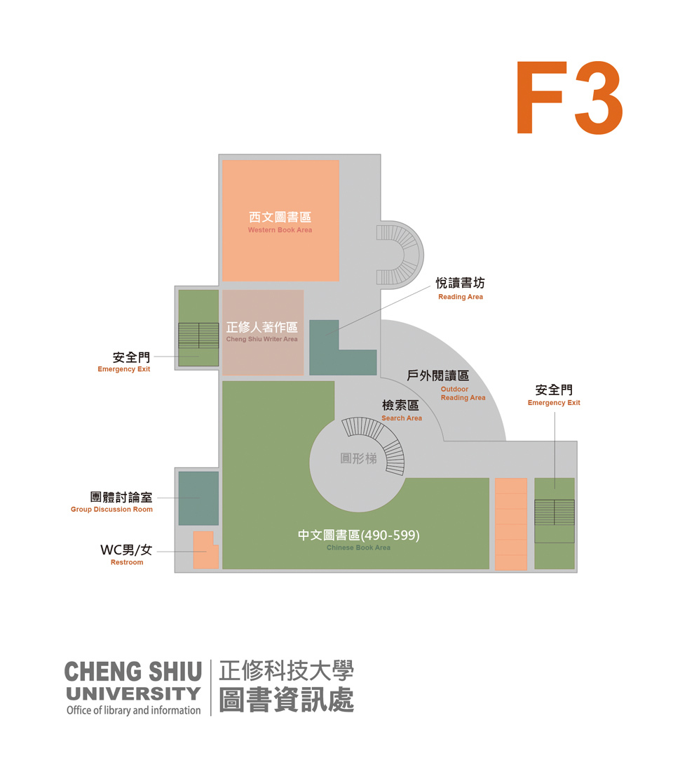 儲藏室、小組討論室、中文圖書區、悅讀書坊、西文圖書區、正修人著作區、資料檢索區、戶外閱讀區
