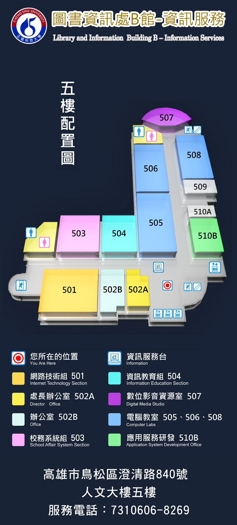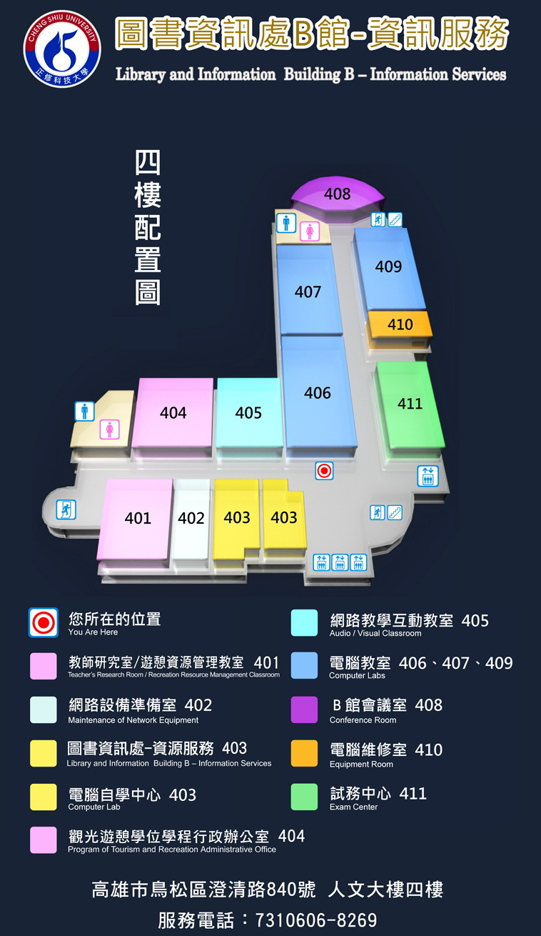 處長室、辦公室、會議室、i學堂、漫畫區、四庫全書、小團體視聽室、中文圖書區、資料檢索區、立體書區、靜思坊、現期期刊區、過期/裝訂期刊區、資訊共享中心